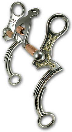 The hand engraved Sterling Silver trimmakes a show bit out of one of the mostpractical training bits designed. TheCathedral mouth is the ultimate tool forachieving a high degree of flexion. Thisbit should be used by the advanced rider on the advanced horse.Features: 8” blued steel Tire Toolshanks with hand engraved SterlingSilver overlay. 5”, Cathedral mouth with inlaid copper bars. |