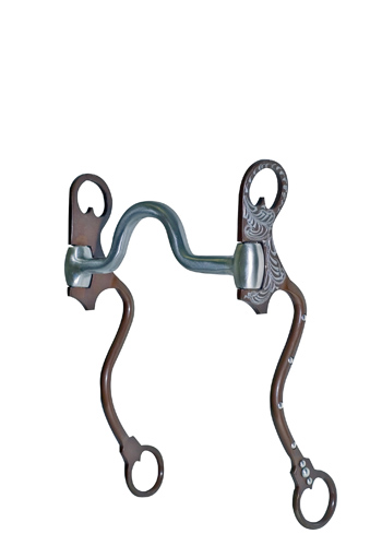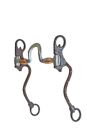 The low port mouthpiece is a low-leverage tool that spreads pressure evenly over the bars andtongue. Ideal for horses just startinginto a curb bit. The Z\x” mouthpiece is a little thicker for the more sensitive or timid horse.Features: 8” hand engravedAluminum Grazing shanks withSilver Concho. 5”, Low Port mouthwith inlaid copper bar |
